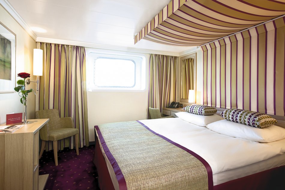 A-Deck 1: komfortable Außenkabine 15,5m². Elegantes Design und edle Materialien mit Safe, Klimaanlage, TV, Föhn, DU/WC