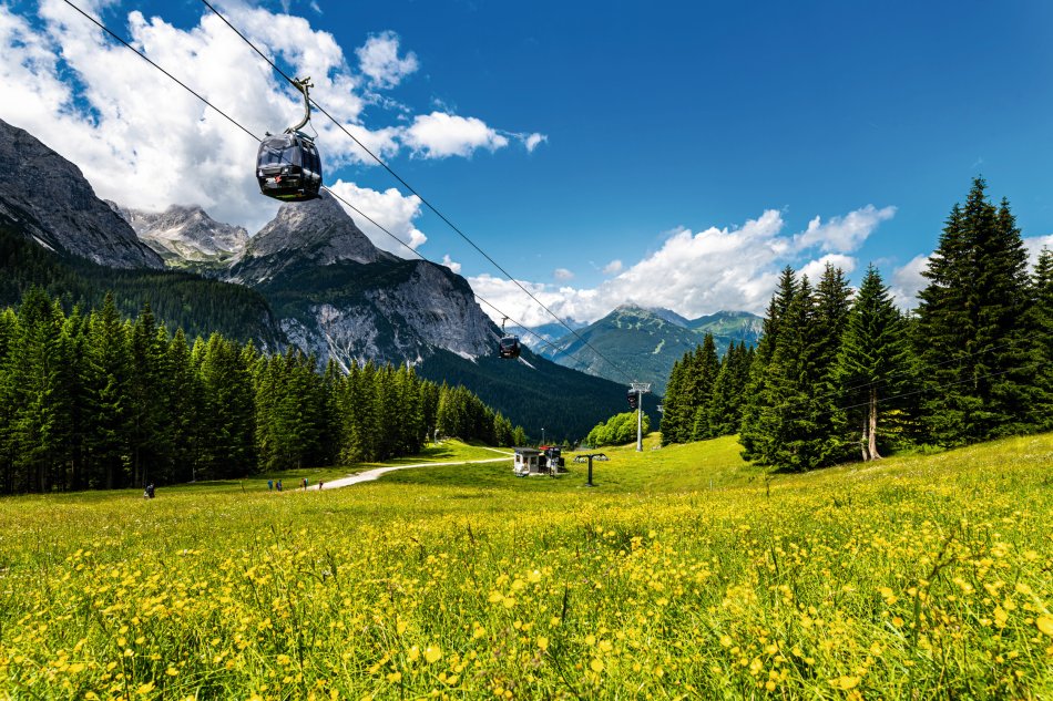 Auf die Ehrwalder Alm gelangen Sie von der Talstation auf einem gut ausgebauten, asphaltierten Zufahrtsweg (ca. 550 Höhenmeter zusätzlich) oder mit der Seilbahn (extra, ca. 15 € )